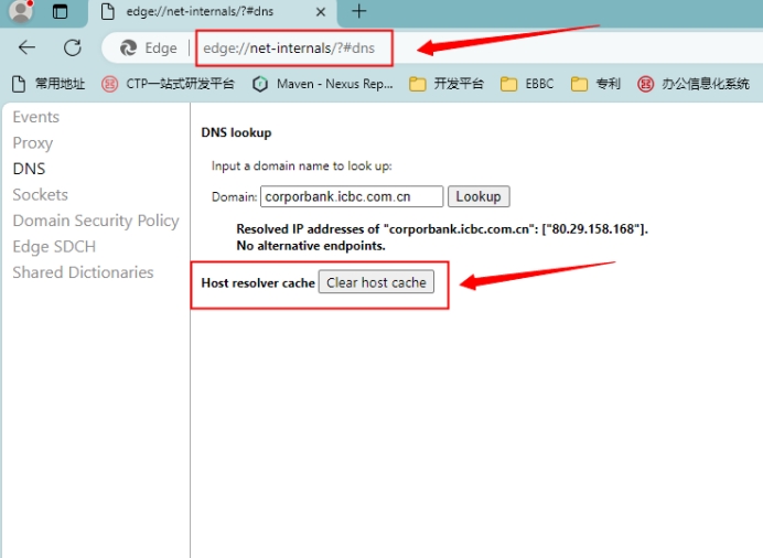 请您在地址栏输入edge://net-internals/?#dns,在Domain地址栏输入corporbank.icbc.com.cn,点击“Clear Host Cache”按钮,然后重启浏览器。