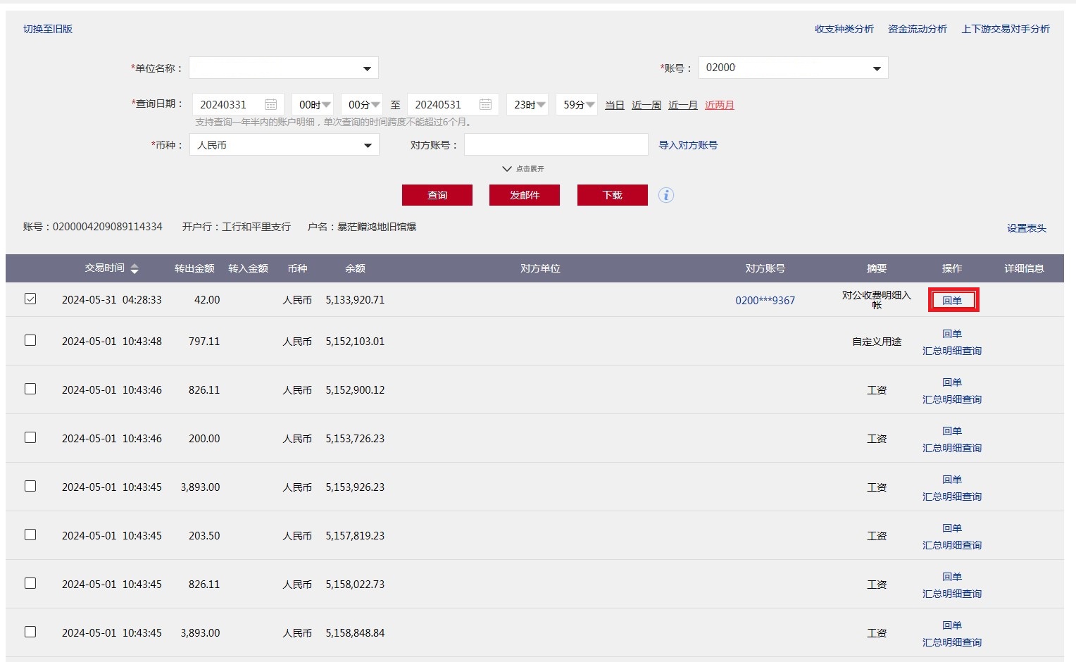 在明细查询结果页面,点击对应明细右侧的“回单”即可查看回单。PDF格式回单单次最多下载200张,提交申请后需等待文件生成,再通过“客户服务-文件异步下载”栏目下载;下载非PDF格式回单条数不能超过3000条。