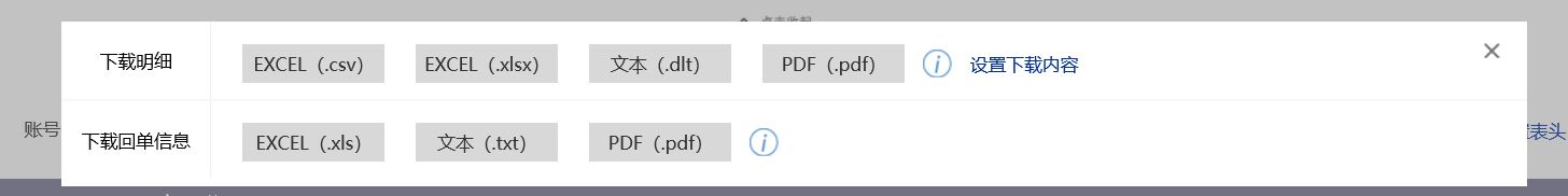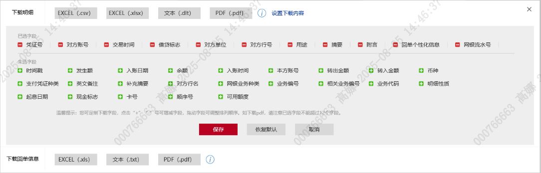 点击“下载”,输入查询条件后可对明细和回单进行下载,点击“设置下载内容”可自定义设置已选字段。