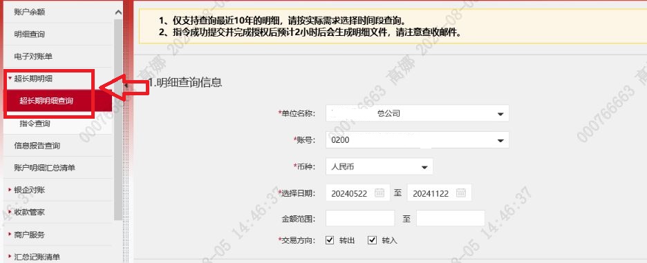 如您需要查询更早以前的交易明细,请选择“账户管理-超长期明细-超长期明细查询”功能,可查询距离当天最早10年的往来户历史明细,单次查询时间区间不能超过两年。